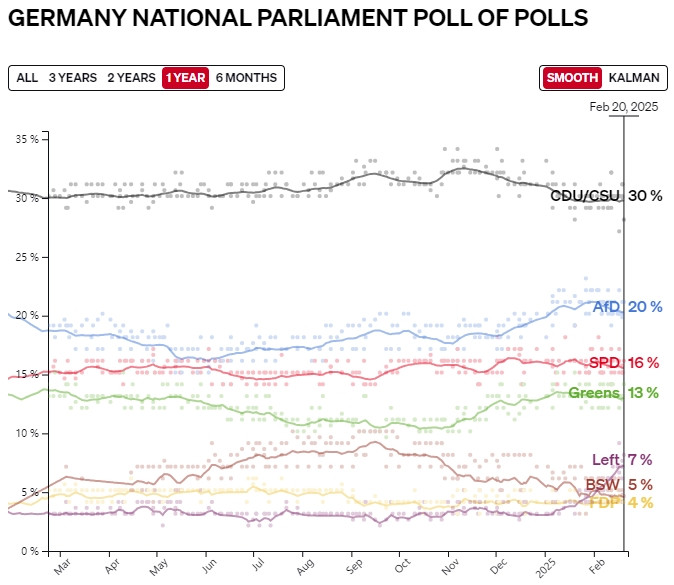 PoliticoEU的最新民调数据显示,截至2月20日,基民盟和基社盟组成的德国联盟党以30%的支持率领先,选择党以20%的支持率位居第二,社民党以16%的支持率排在第三。